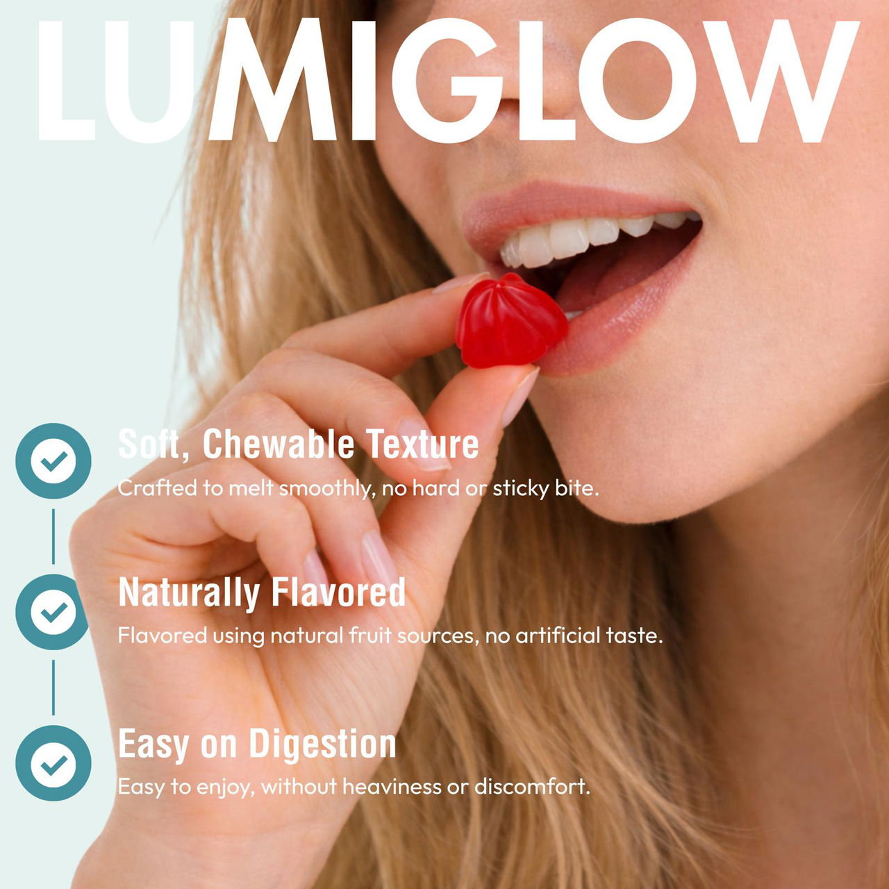 LumiGlow™ delivers high-dose nourishment with superior absorption, and plant based ingredients, designed for real results. The smarter, tastier alternative to messy powders or hard-to-swallow capsules. Pectin (Plant Extract), Resistant to Melting. "Natural Flavor"